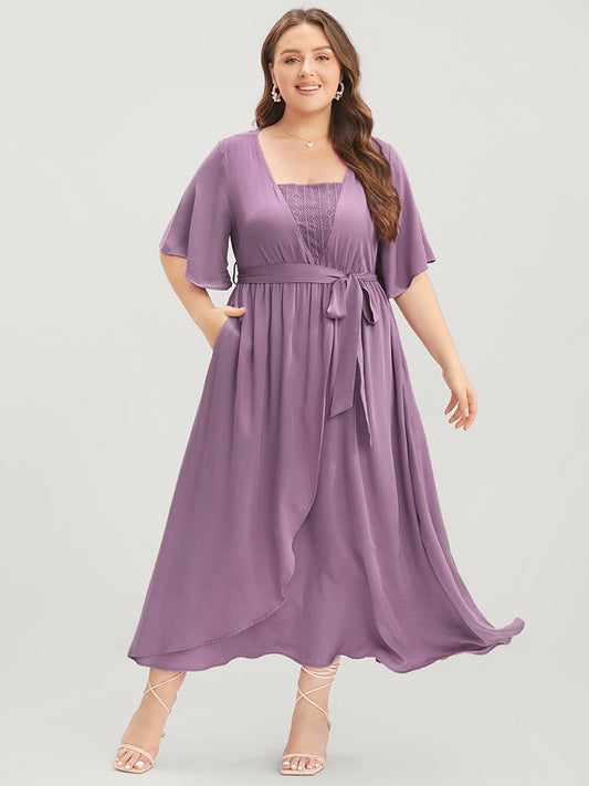 Solid Lace Patchwork Pocket Asymmetrical Belted Ruffles Dress