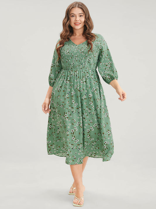 Ditsy Floral V Neck Pocket Lantern Sleeve Shirred Flutter Dress