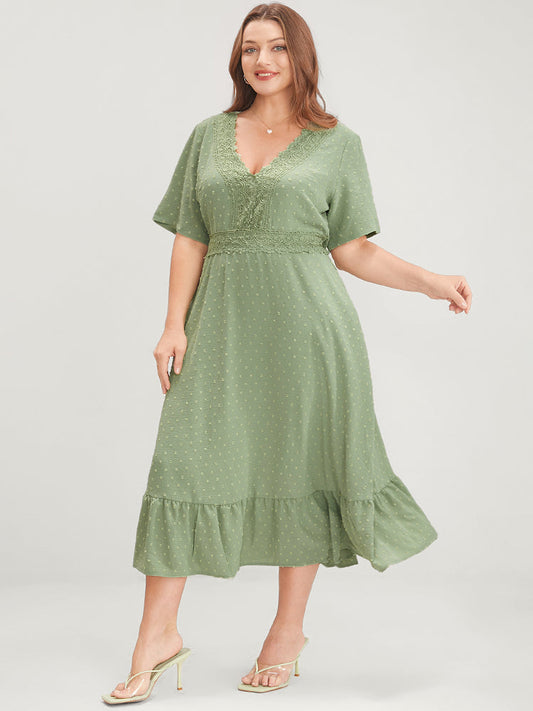 Solid V Neck Pocket Contrast Lace Flutter Hem Dress