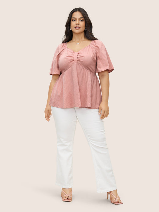Plain Heart Neckline Ruched Ruffle Sleeve Blouse