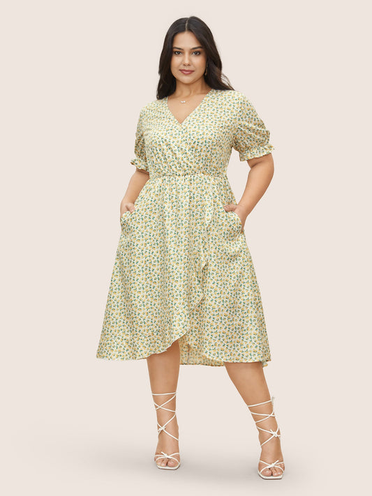 Citrus Lemon Print Overlap Collar Lantern Sleeve Dress