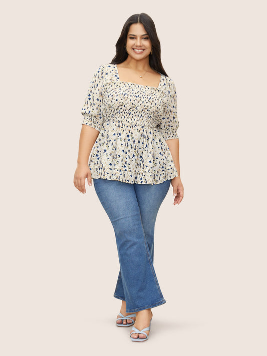 Ditsy Floral Ruffles Shirred Puff Sleeve Blouse