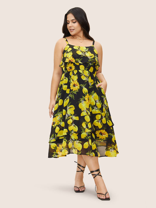 Citrus Lemon Print Ruffle Trim Belted Cami Dress