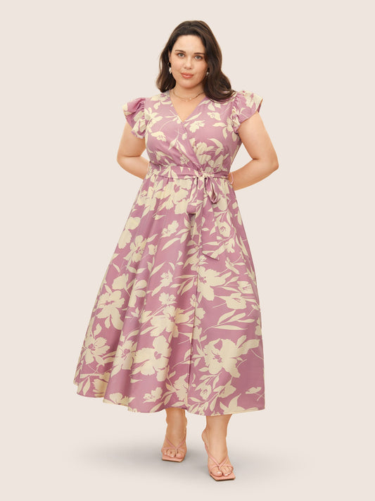 Silhouette Floral Print Wrap Ruffle Cap Sleeve Dress