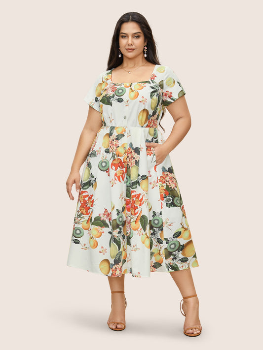 Citrus Texture Ruffle Sleeve Button Detail Dress
