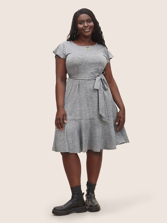 Solid Patchwork Ruffle Cap Sleeve Belted Dress