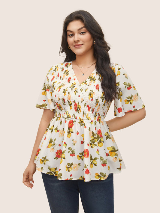 Citrus Lemon Print Elastic Waist Shirred Wrap Ruffles Blouse