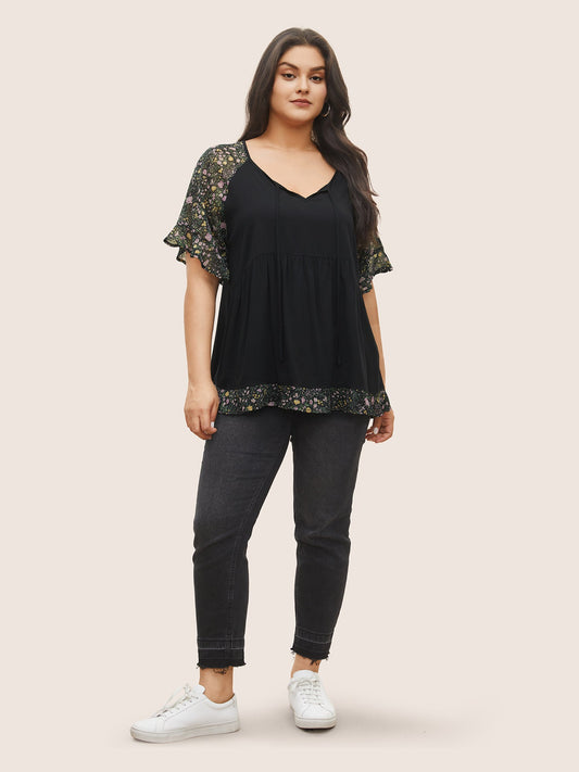 Ditsy Floral Patchwork Ties Flutter Sleeve Blouse