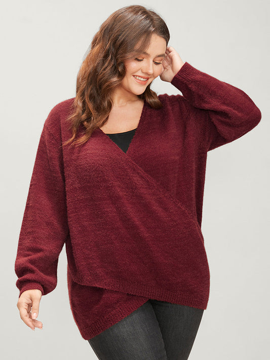 Solid Soft Plush Knit Crossover Hem Knit Top
