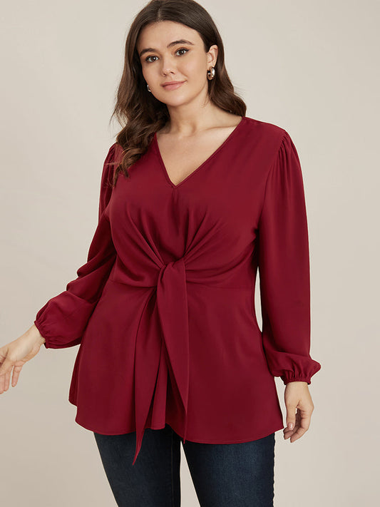 Solid V Neck Lantern Sleeve Knotted Front Blouse