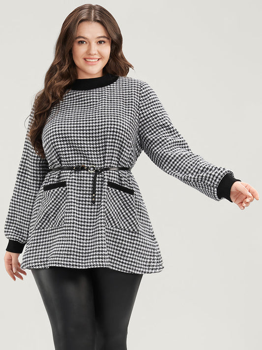 Contrast Trim Pocket Mock Neck Houndstooth Sweatshirt