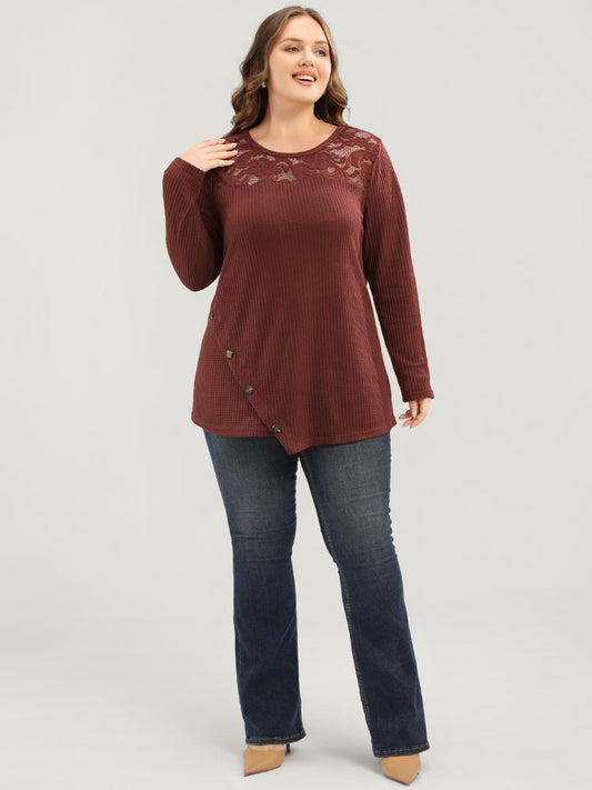 Solid Lace Button Detail Waffle Knit Sweatshirt