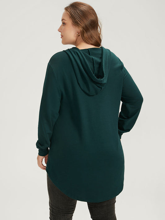 Solid V Neck Arc Hem Drawstring Hooded Sweatshirt