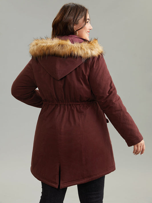 Contrast Hooded Fuzzy Trim Drawstring Padded Coat