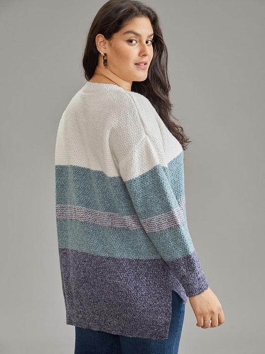 Colorblock Striped Notched Belted Lantern Sleeve Dress