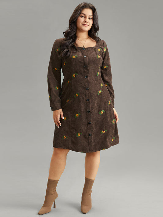 Ditsy Floral Embroidered Corduroy Square Neck Dress
