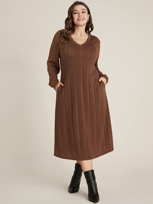 Solid V Neck Cable Knit Pocket Textured Dress Without Belt