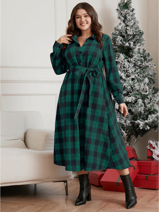 Plaid Shirt Collar Pocket Belted Button Up Dress