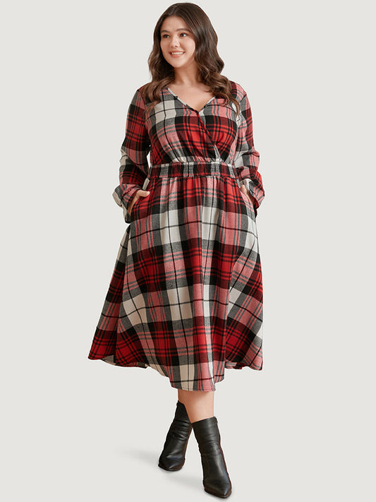 Plaid Shirred Pocket Lantern Sleeve Wrap Midi Dress Without Belt