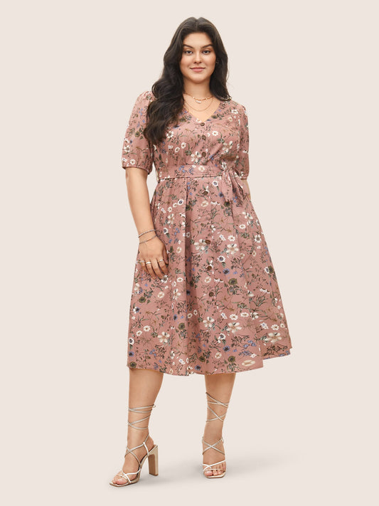 Ditsy Floral Belted Lantern Sleeve Button Up Dress