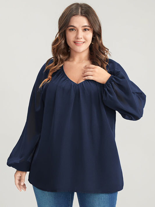 Solid V Neck Mesh Lantern Sleeve Blouse