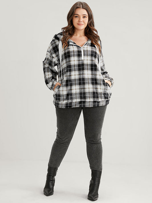 Plaid Pocket Half Zipper Drawstring Hooded Sweatshirt