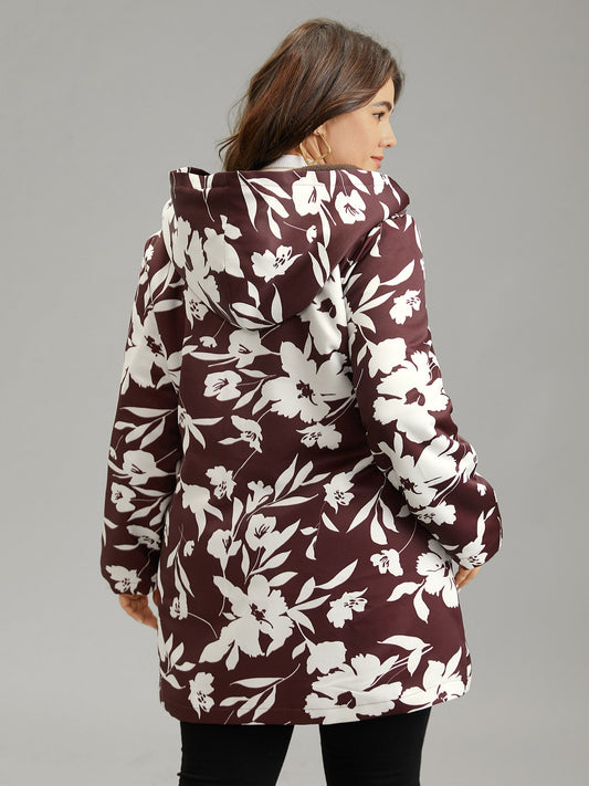 Silhouette Floral Print Fuzzy Zipper Hooded Coat