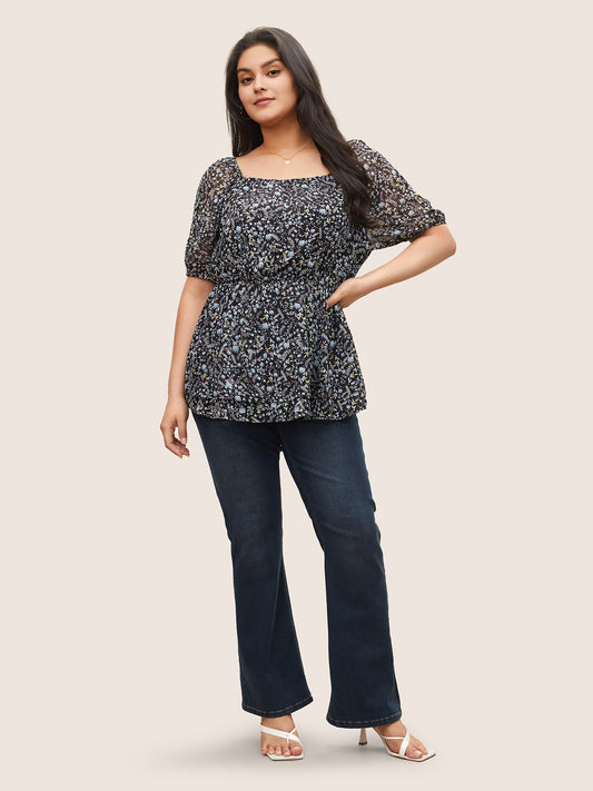 Ditsy Floral Mesh Square Neck Layered Hem Blouse