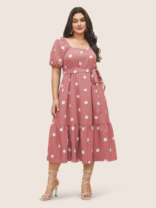 Polka Dot Gathered Belted Lantern Sleeve Dress