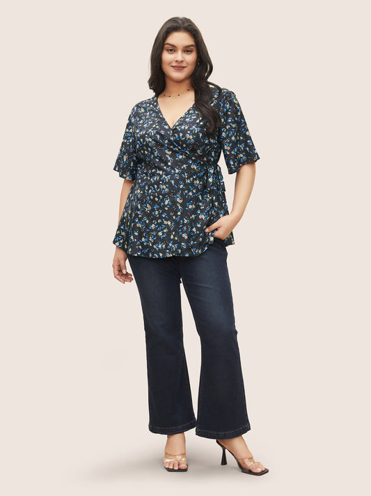 Ditsy Floral Ties Wrap Bell Sleeve Blouse