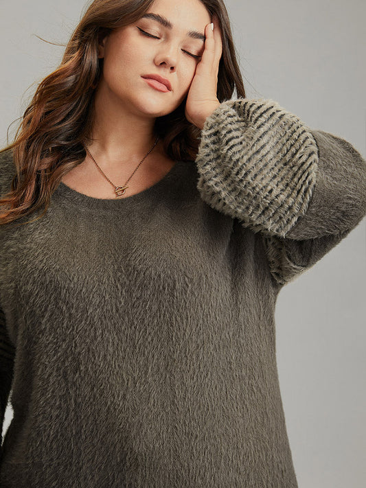 Striped Patchwork Lantern Sleeve Fluffy Sweatshirt