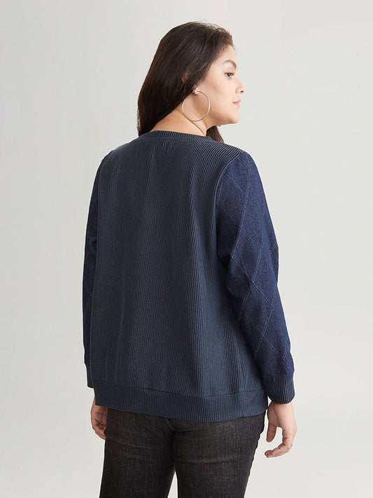 Denim Effect Patchwork Waffle Knit Sweatshirt
