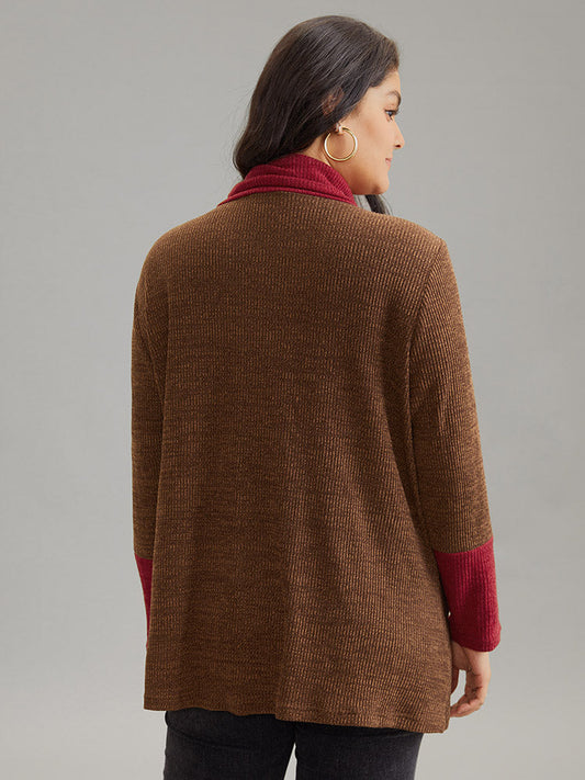 Rib Knit Contrast Funnel Neck Patched Pocket Sweatshirt