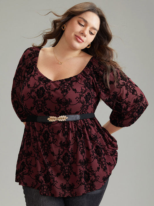 Silhouette Floral Print Contrast Flocking Square Neck Blouse