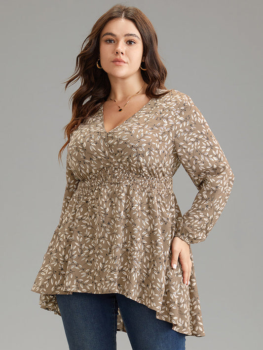 Ditsy Floral Shirred Elastic Waist High Low Hem Blouse