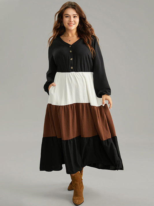 Colorblock Patchwork Lantern Sleeve Button Detail Dress