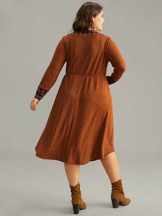 Rib Knit Patchwork Plaid Pocket Button Detail Dress