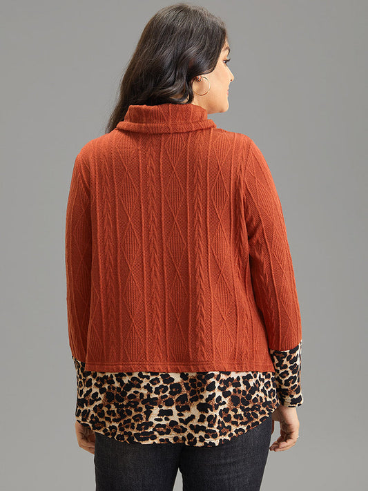 Leopard Patchwork Turtleneck Arc Hem Jacquard Sweatshirt