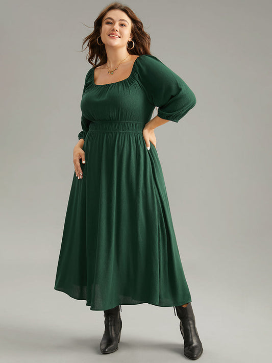 Rib Knit Mock Neck Button Detail Lantern Sleeve Dress