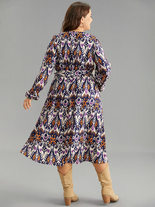 Boho Print Overlap Collar Elastic Waist Belted Dress