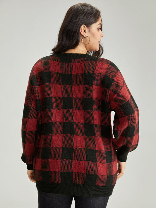 Plaid V Neck Lantern Sleeve Loose Pullover