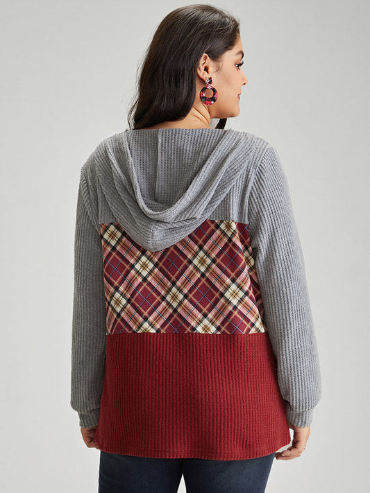 Plaid Patchwork Textured Hooded Contrast Sweatshirt
