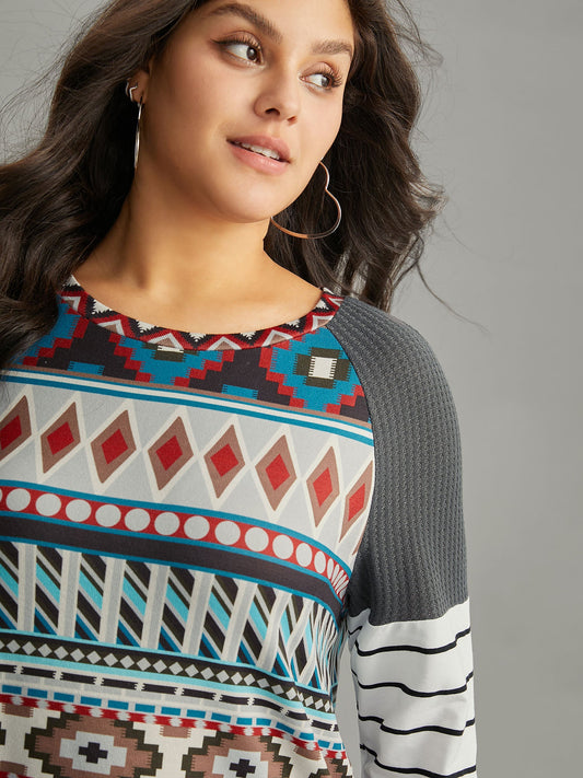 Boho Print Patchwork Waffle Knit Raglan Sleeve T-shirt