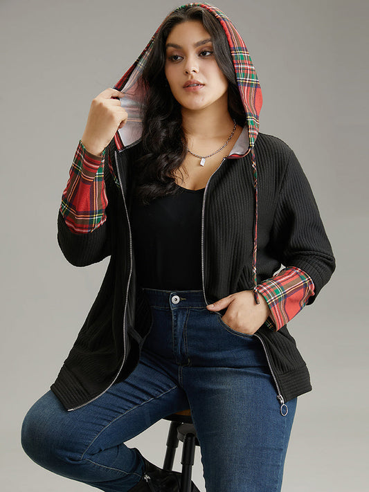 Christmas Plaid Patchwork Hooded Zipper Sweatshirt