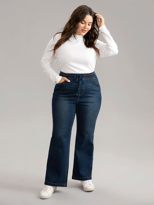 Dark Wash Elastic Waist Drawstring Straight Leg Jeans