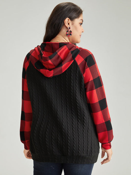 Plaid Texture Contrast Hooded Raglan Sleeve Sweatshirt