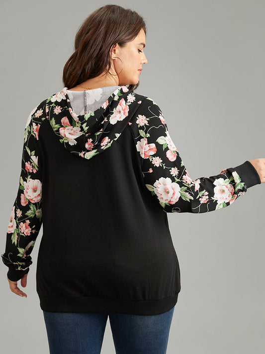 Floral Patchwork Pocket Rib Knit Hooded Sweatshirt