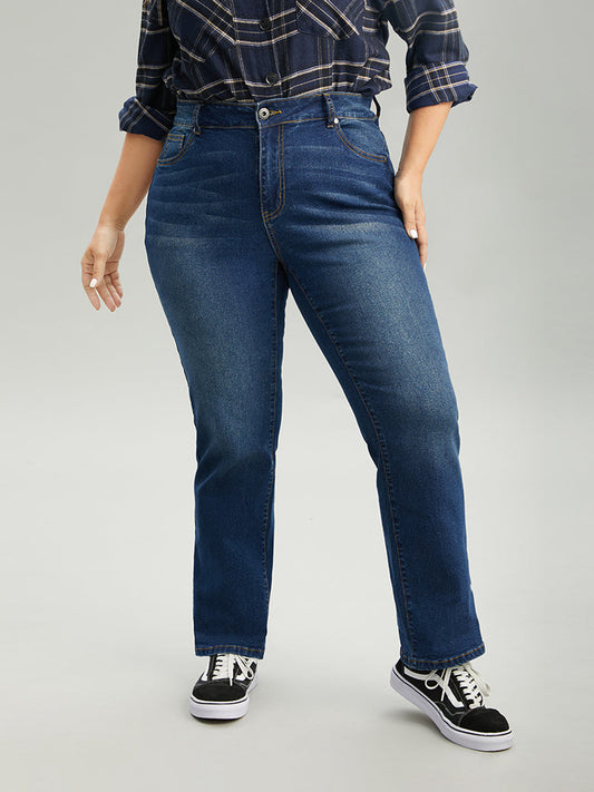 Straight Leg Zipper Roll Hem Dark Wash Jeans