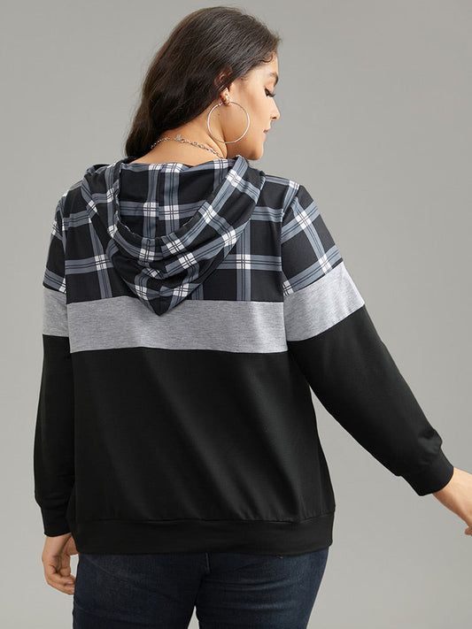 Colorblock Contrast Plaid Kangaroo Pocket Sweatshirt