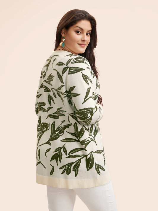 Leaf Pattern Patch Pocket Jacquard Cardigan